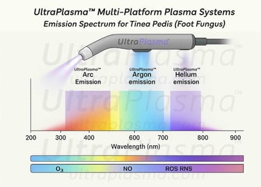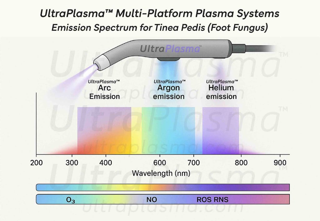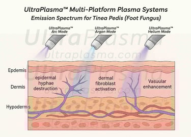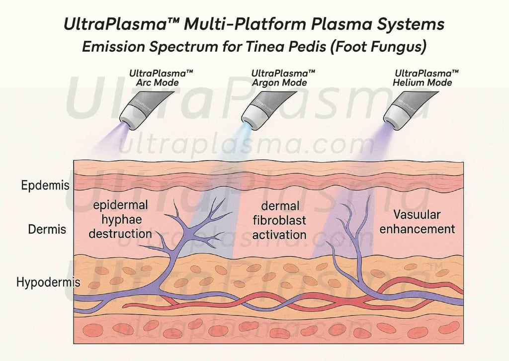 Tinea pedis is caused predominantly by Trichophyton rubrum and Trichophyton interdigitale, thriving in warm, moist conditions. Traditional treatments include topical and oral antifungal agents, but recurrences and drug resistance are common. Plasma medicine has emerged as a non-thermal, drug-free modality leveraging ionized gases to disrupt microbial life cycles while promoting tissue repair. UltraPlasma™ integrates multiple plasma outputs to tailor energy, gas composition, and depth of action.