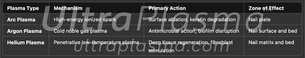 Onychomycosis (tinea unguium) is a prevalent fungal infection of the nail unit, often caused by dermatophytes, Candida species, and nondermatophytic molds. Traditional antifungal therapies suffer from long treatment durations, recurrence, and limited nail penetration. The UltraPlasma™ multi-platform plasma system—utilizing arc, argon, and helium plasma technologies—offers a novel, non-invasive treatment modality. This review details the mechanism of UltraPlasma™ in fungal nail infections, emphasizing its interaction with nail layers, pathogen types, and the biochemical activity of generated reactive gases such as ozone (O₃), nitric oxide (NO), and reactive oxygen/nitrogen species (RONS). Figures illustrate emission spectra, cross-sectional nail penetration, gas interactions, and clinical progress. The integration of photothermal, photochemical, and bioelectric effects renders this method an effective solution for resistant or recurrent onychomycosis.