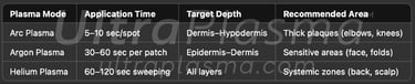 Arc Plasma (blue-white): High energy and deep tissue reach; ideal for hyperkeratotic and thickened lesions. Its electric arc produces intense ionization and minor ablation.