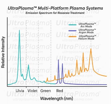 UltraPlasma™ is a next-generation therapeutic system combining arc plasma (electrical discharge), argon plasma (inert thermal stream), and helium plasma (gentle, deep-penetrating waveforms). Each platform produces bioactive gases and UV photons that can penetrate skin layers, offering synergistic effects on vascular, immune, and connective tissue components implicated in rosacea.