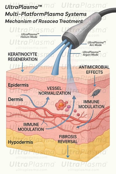 Rosacea is a chronic, inflammatory dermatological condition characterized by facial erythema, telangiectasia, papules, pustules, and phymatous changes. Standard treatments often fail to address the vascular and immune dysregulations at the root of this disorder. UltraPlasma™, multi-platform plasma device that integrates arc, argon, and helium plasma technologies, offers a non-invasive therapeutic alternative by targeting multiple skin layers and cellular pathways. This article explores UltraPlasma™’s mechanisms of action in rosacea treatment, highlighting its modulation of oxidative stress, vascular responses, immune reactions, and dermal remodeling via ozone (O₃), nitric oxide (NO), and other reactive plasma-generated species. Figures illustrate plasma penetration depth, vascular normalization, gas interactions, and clinical improvements